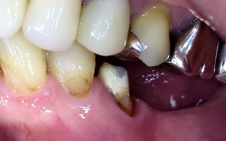 拝見したところ、左下奥歯に装着されていた金属の被せ物が虫歯の再発が原因で外れ、土台だけの状態になっていました。