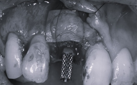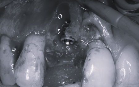 まずは歯根が折れた右上前歯を抜き、その直後にインプラントの埋入手術を行います。これは抜歯即時埋入といい、治療期間の短縮が期待できる方法です。