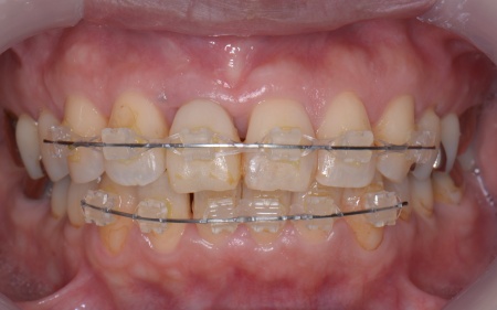 その後、歯の表面に四角いボタン状の装置を接着し、そこにワイヤーを通して歯を動かすマルチブラケット装置による上下前歯の部分矯正を開始します。