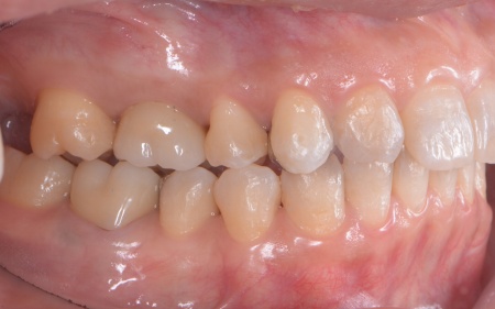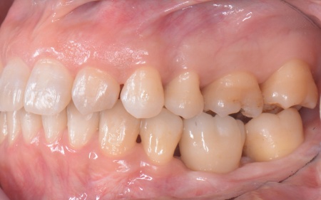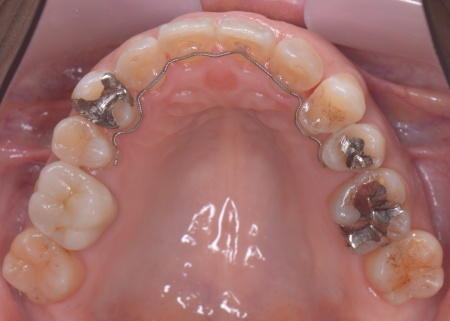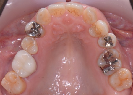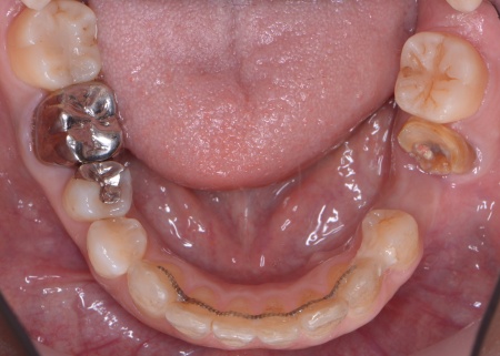 さらに全体の噛み合わせを改善するため矯正治療を並行して行うこと、右上下奥歯の合わなくなった被せ物には矯正終了後に新しく作り直すこととしました。