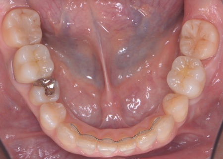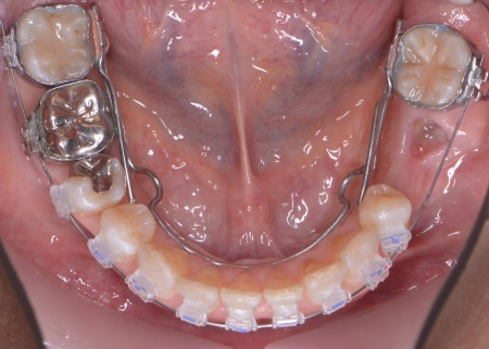 ②①と並行して上下歯列にワイヤー矯正のマルチブラケット装置を装着し、歯並びと噛み合わせを整える。