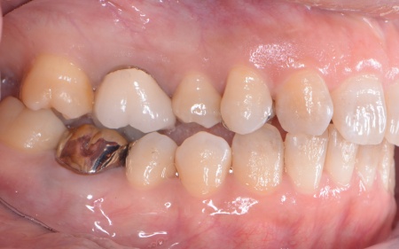 また、右の上下奥歯2本に装着されている白い被せ物や銀歯が劣化により歯に合わなくなり、虫歯の再発リスクが高まっていました。