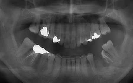 拝見したところ、左下奥歯(第1大臼歯)は以前、歯根分割処置が行われていました。