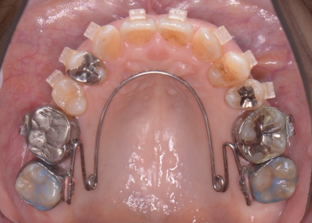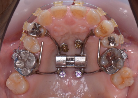 ①上あごの骨が狭く歯が並ぶスペースが不足しているため、まず上あごの骨の幅を広げる急速拡大装置を装着する。