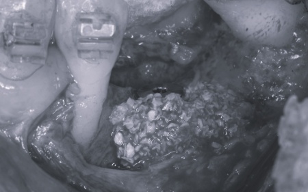 インプラントを支えるための骨の量が十分でないため、人工材料を用いて骨を再生させる骨造成(GBR)を併用しながらインプラントを埋入する。