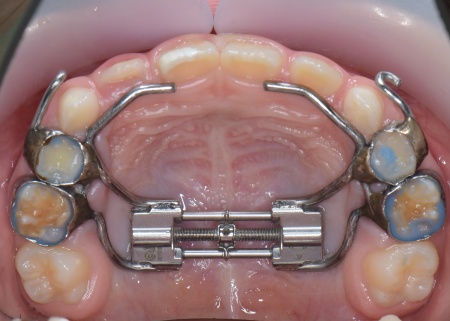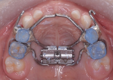 治療の際は、上あごにあごの骨の幅を広げるための固定式の矯正装置である急速拡大装置を装着しました。さらに、歯並びを前方に広げるため上顎前方牽引装置(じょうがくぜんぽうけんいんそうち)も併用しています。