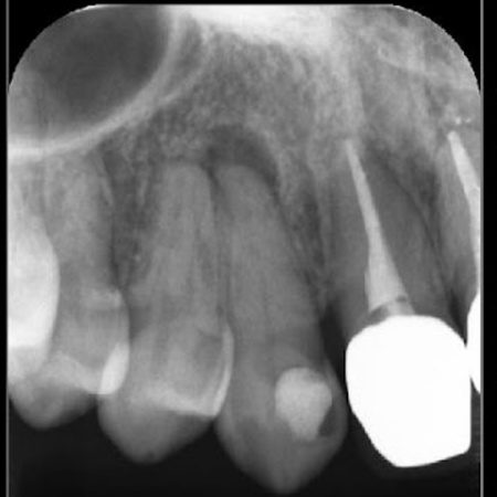 レントゲン検査を行った結果、右上前歯の歯根の先端に膿が溜まる根尖(こんせん)病巣が確認できました。