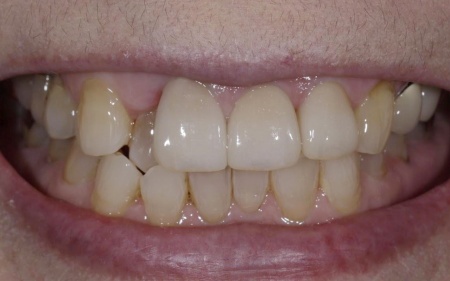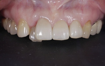 しかし、今回は根本的に前歯の審美性を改善したいと希望されたため、セラミックの薄い板を貼り付ける「ラミネートベニア」による修復を提案し、同意いただきました。