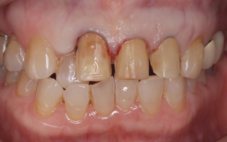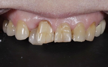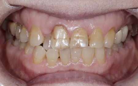 70代女性 経年劣化した上前歯の詰め物を外しラミネートベニアで修復した症例