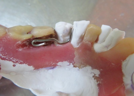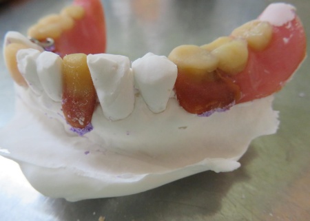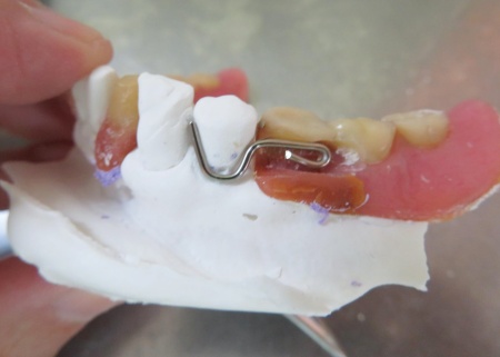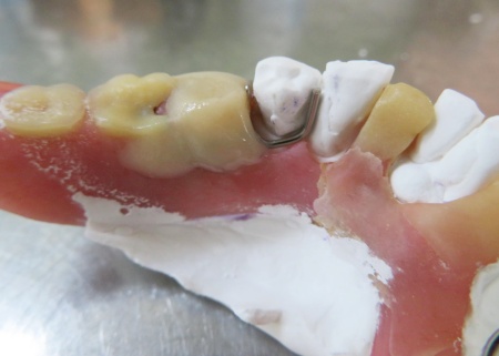 完成した模型に入れ歯を装着し、クラスプを固定する場所を削りました。