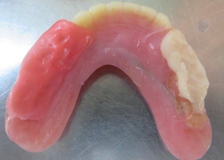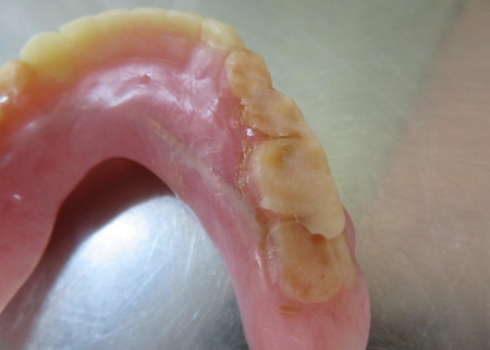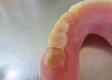 拝見したところ、装着している総入れ歯の人工歯部分がすり減り、噛み合わせが低くなっていました。