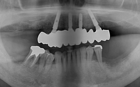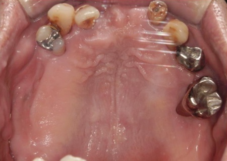 「転倒して上前歯のブリッジがとれた。他院で上あごの総入れ歯をすすめられたが、ほかに方法がないか知りたい」とセカンドオピニオンとしてご来院いただきました。