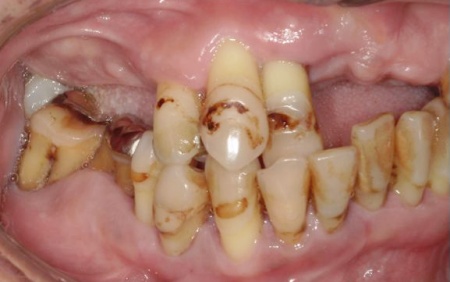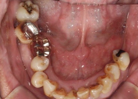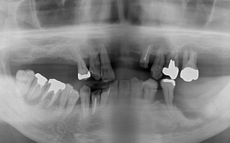 残っている上の歯7本(左右上側切歯、左右上犬歯、左右上第1小臼歯、左上第1大臼歯)と右下奥歯2本(第2大臼歯、第3大臼歯)は残すことが難しく抜歯が必要な状態です。