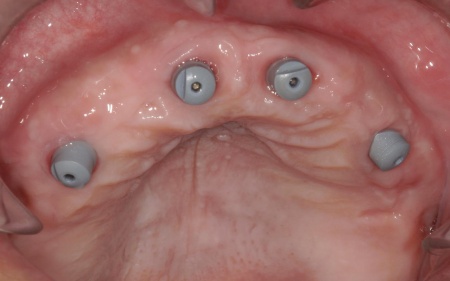①上の歯7本、右下の奥歯2本を抜歯する。上あごには抜歯と同時に4本のインプラントを埋め、その上に10本分の仮歯を取り付けるオールオンフォーを行う。