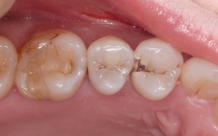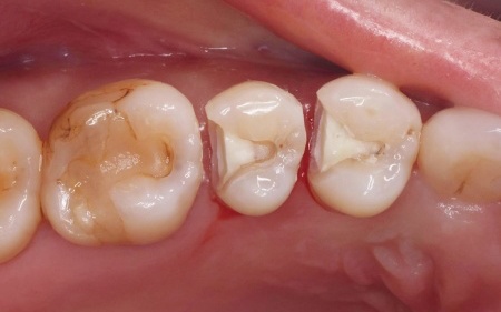 患者様は噛む力が強く、その影響で歯の外側を覆っている組織(エナメル質)が破折していました。