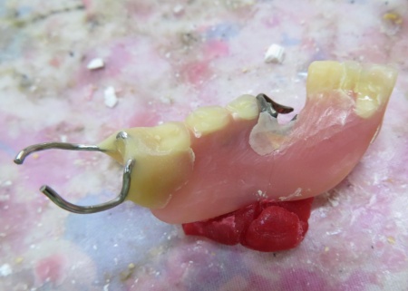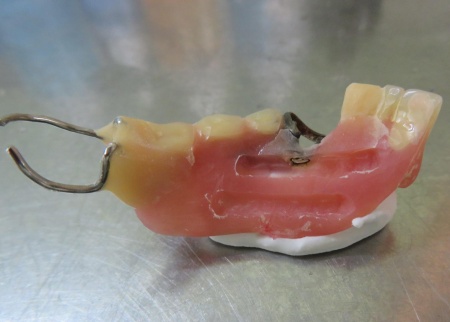 左下奥歯にかけるクラスプ(入れ歯を固定するための金属製の留め具)は、以前当院で修理を行っています。
