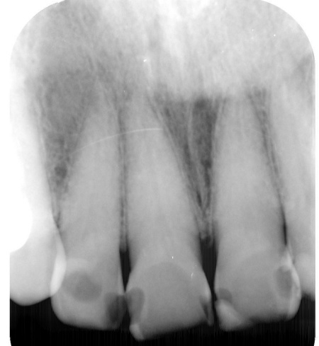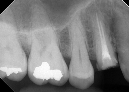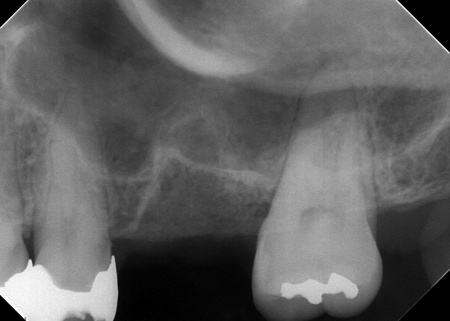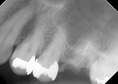 また右上奥歯には、歯根の先に炎症が起きて膿が溜まる根尖性(こんせんせい)歯周炎が認められます。