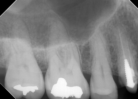 次に、右上奥歯の古い材料(以前の根管治療に使用したもの)を除去し、歯根内部の洗浄と消毒をしてから新しい材料で密封し、被せ物を作製して装着しました。