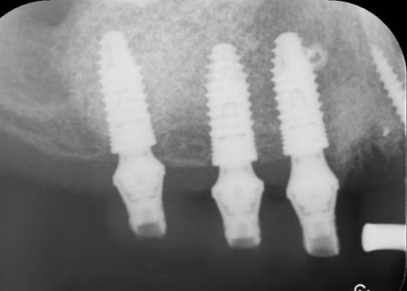 右上前歯も同様に骨が少なかったため、こちらは骨の移植を行って骨量を確保したのち、インプラントを埋入しました。