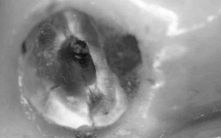 もともと入っていた古い被せ物を除去すると、歯根に亀裂が入っていました。こちらも歯の温存が難しいと判断し、抜歯処置を行いました。