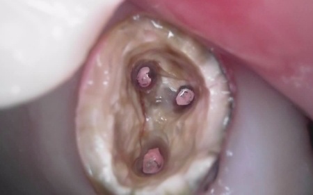 右上奥歯2本に仮歯が入り、噛み合わせが安定した状態になったため、根尖病巣を発症している右上奥歯の治療を開始します。