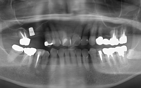 その間、右上奥歯2本が欠損したままでは噛み合わせが崩れるリスクがあったため、早期にすでに欠損していた右上奥歯(第1大臼歯)部位にのみ、インプラントの埋入を行いました。