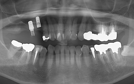 抜歯と根管治療を行ったあとは、欠損部を補うために、2本のインプラントを埋入する方法を提案しました。