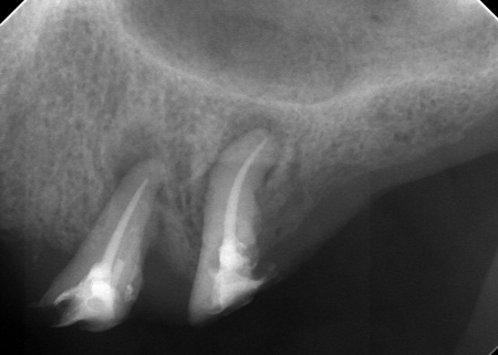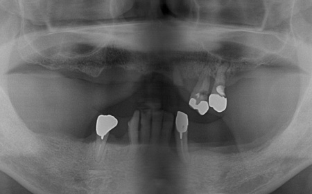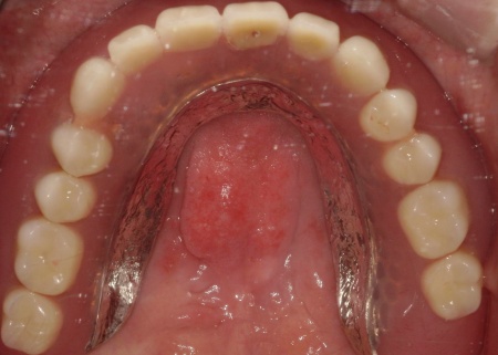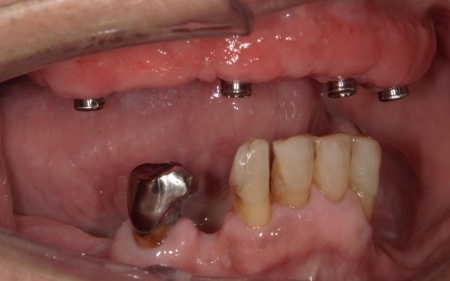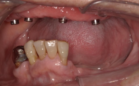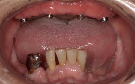当初は、上顎に残存歯(残根)を残したまま装着する「残根上義歯(オーバーデンチャー)」にて治療することを提案し、治療を進めていました。