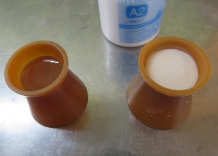 即時重合レジンは、粉と液を混ぜると数分で硬化する性質がある材料です。
