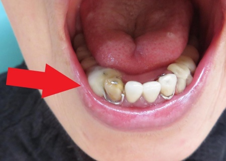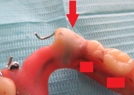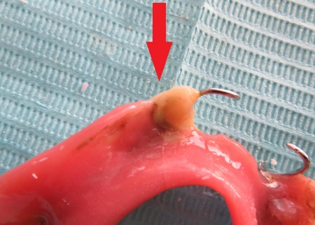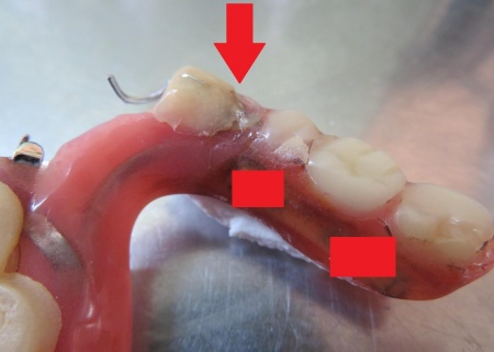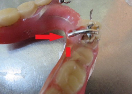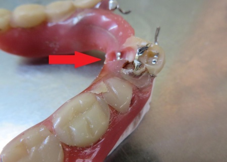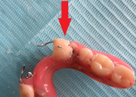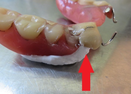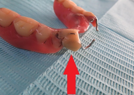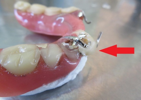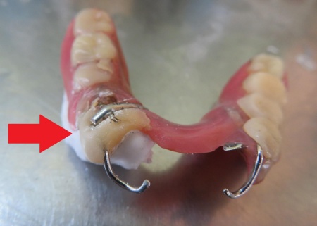 入れ歯を拝見したところ、右下の前から3番目の歯にあたる部分が折れていました。