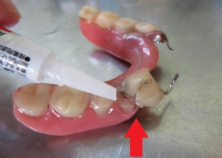 まず、入れ歯の折れた部分を技工用の瞬間接着剤で仮止めします。