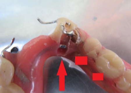 この溝に、入れ歯の強度を高めるための補強用金属線を埋め込み、同じ部分が再度折れないよう調整しました。