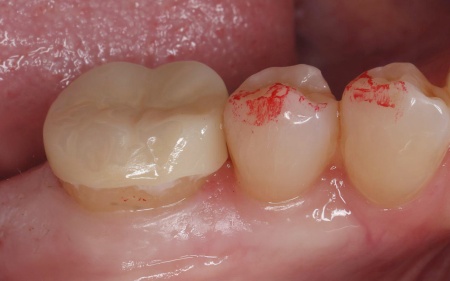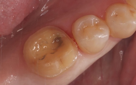 オンレーの素材には、セラミックの中でも強度が高く、奥歯の修復に適しているジルコニアを採用しました。ジルコニアは白い素材のため、見た目も自然に仕上がります。