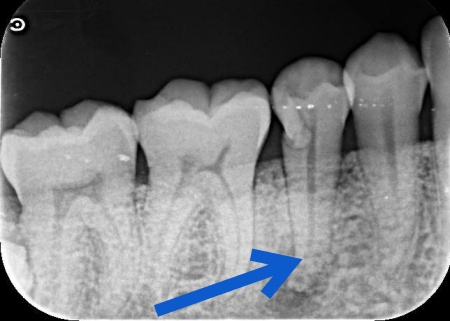 原因を調べるためにレントゲン検査を行ったところ、歯の根の先に炎症が起きている様子が確認できました。