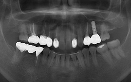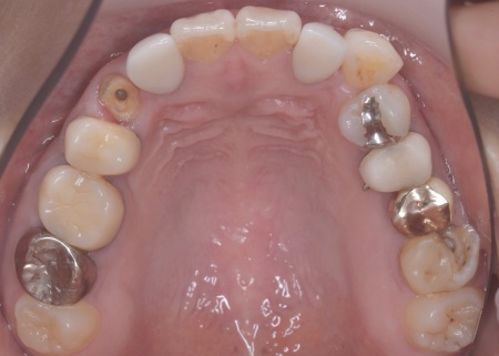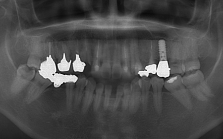 なお、左上の奥歯には人工歯根を埋め込んで失った歯を補うインプラントが装着されていたものの、人工歯根の位置や骨との結合状態に問題はありませんでした。