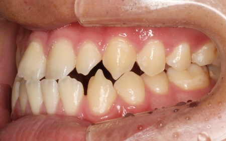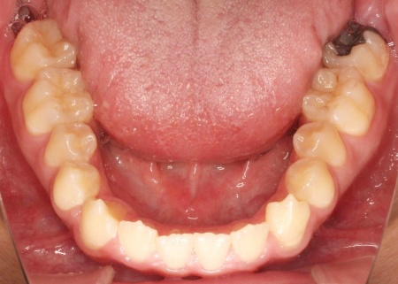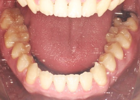 拝見したところ、上下前歯の先端同士が触れ合う「切端咬合(せったんこうごう)」の状態でした。