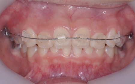 上前歯6本と左右の奥歯の表面に「ブラケット」と呼ばれるボタン状の装置を設置し、そこにワイヤーを通して歯を少しずつ動かしていきました。