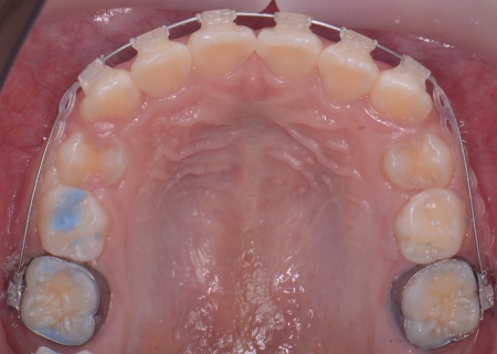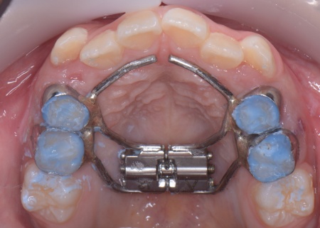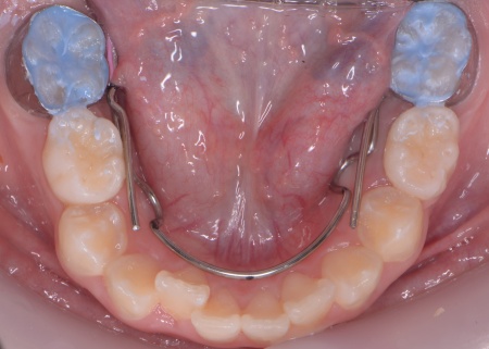 まず、上顎に顎の骨を広げるための固定式の矯正器具「急速拡大装置」を、下顎には歯並びの幅を広げるための「リンガルアーチ」を装着します。