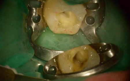 まず、既存の詰め物を除去したうえでラバーダムを装着し、治療する歯のみを隔離して清潔を保ちながら処置できる状態を整えます。