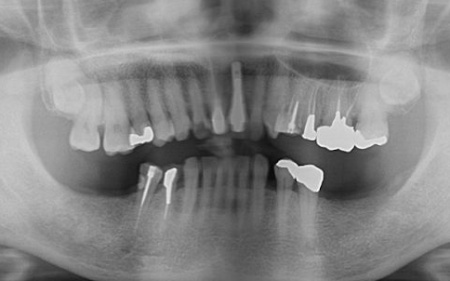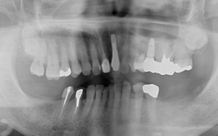 拝見したところ、左上奥歯2本(第1小臼歯、第2小臼歯)の被せ物が外れていたため、レントゲン撮影で詳しく検査をした結果、歯根が折れていることが確認できました。